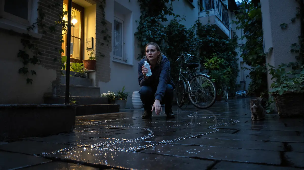 Ce qui frappe, c’est le contraste. D’un côté, une astuce très étrange, presque folklorique. De l’autre, un retour bien réel du chat, juste devant le balcon, là où la trace se terminait.
